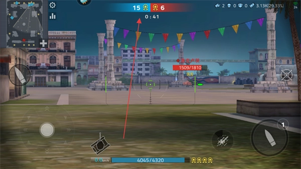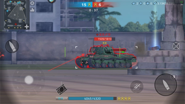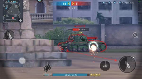 留意上方顯示的15:6比分與0:41時間,在剩余時間里主動發(fā)起攻勢,降低敵方坦克的血量(例如1509/1810這樣的數(shù)值)。