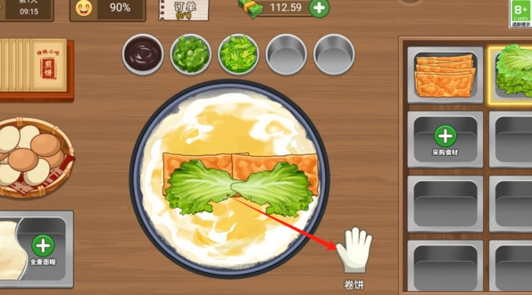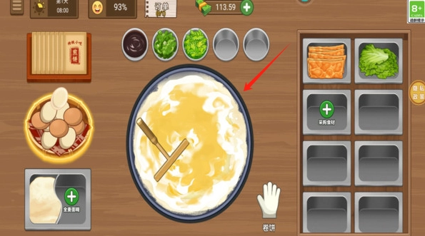 首先你需要點擊采購食材將煎餅攤的空白處都填滿