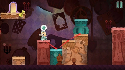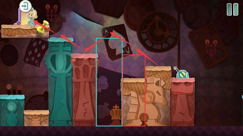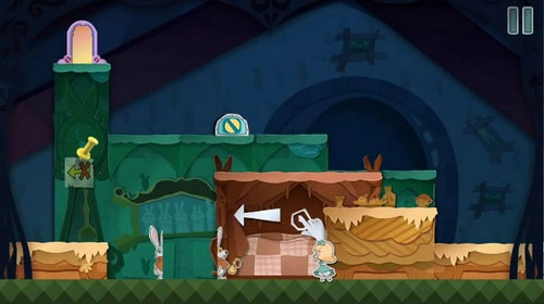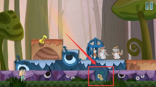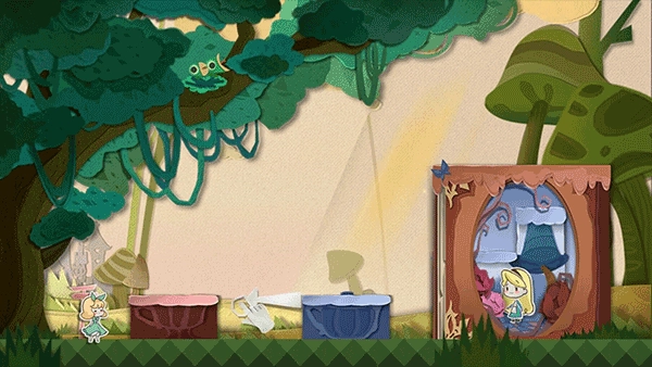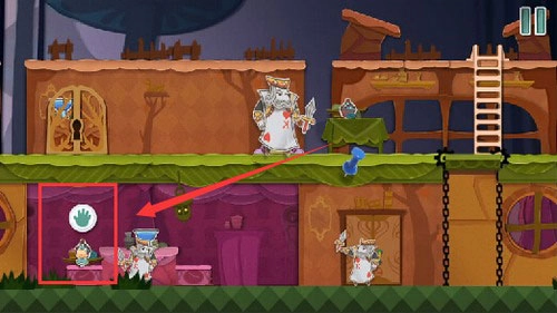 把黃色場景向右滑動,讓變小藥水和變大蛋糕重合,用鑰匙打開門后,撲克兵就會喝下變小藥水,變成最小的狀態(tài)。