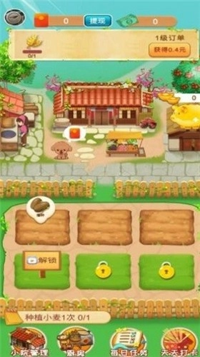 游戲目標:打理并拓展自己的農院,達成各類訂單,獲取紅包獎勵。