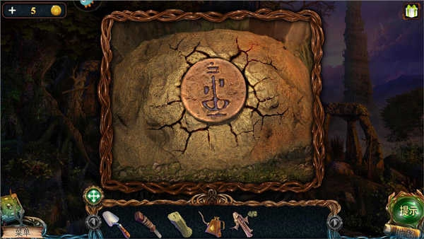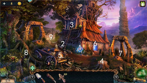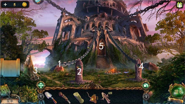 用鐮刀割掉1處的雜草,就能露出第五塊和尚雕塑;在2處拿到鑰匙后,再用鏟子挖開松軟的土壤,就能挖出音樂(lè)盒的鼓部件。