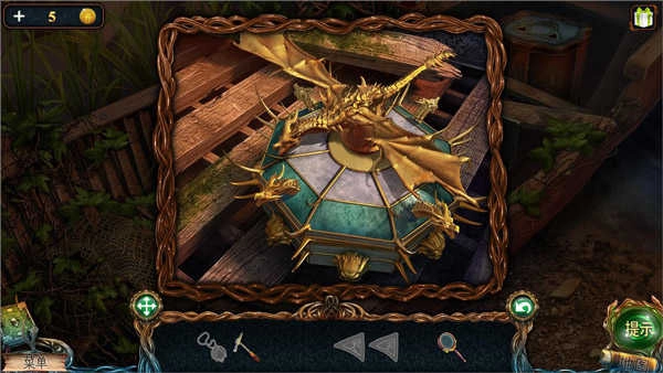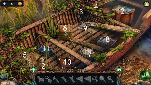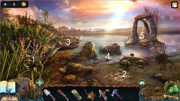 點(diǎn)擊位置3的小船,在位置1找到龍形塑像,從位置2獲取鑰匙,完成位置4的拼圖小游戲后得到剪刀;用剪刀剪開位置5的藤蔓,拿到天使雕塑。