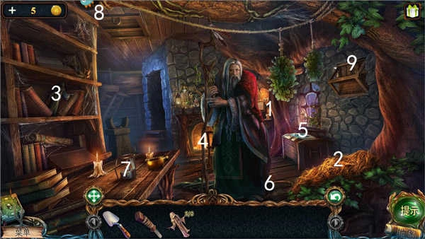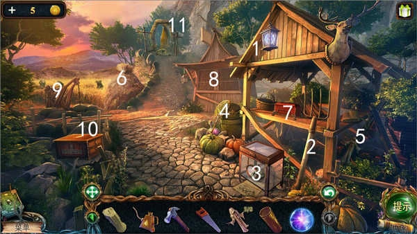 農(nóng)具間里,1號(hào)位置撿到第二個(gè)能量球;2號(hào)位置拿到大叉,可用來(lái)扎破6號(hào)位置的干草堆,從中找到第六塊和尚雕塑;3號(hào)位置的書籍有關(guān)于“哈芬斯”的線索;4號(hào)位置能得到捕蟲網(wǎng);5號(hào)位置發(fā)現(xiàn)了第七塊和尚雕塑。
