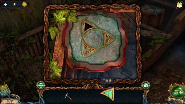 使用放大鏡對(duì)9處墻面進(jìn)行掃描,從中找出四個(gè)隱藏的符號(hào);把這些符號(hào)輸入到11處的機(jī)關(guān)中,就能成功得到第二枚三角牌。