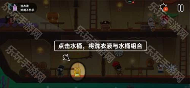 制造陷阱來擺脫海盜,先踢倒水桶,接著點擊右邊的門,之后再返回。