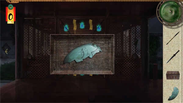 右側木桌得到空碗③和針灸書 依照針灸書 針刺掛畫正確位置得到魚飼料