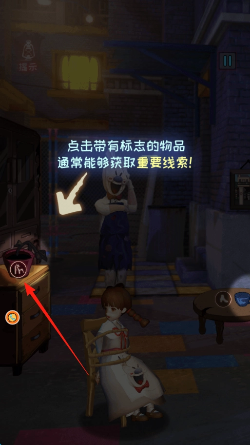 進(jìn)入場景,按提示【點(diǎn)擊帶有標(biāo)志的物品通常能夠獲取重要線索】,紅箭頭指花盆,點(diǎn)擊互動(dòng),獲線索道具,推進(jìn)解謎,注意小丑。