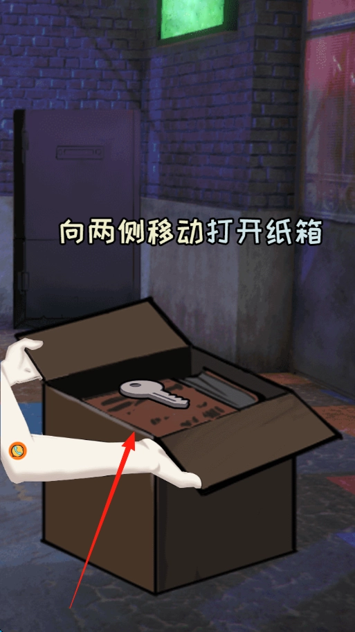 按提示【向兩側(cè)移動(dòng)打開紙箱】,滑動(dòng)屏幕兩側(cè)拉,開箱子,獲鑰匙紅箭頭,用鑰匙開對(duì)應(yīng)門鎖,推進(jìn)解謎,注意場景病院走廊,體驗(yàn)密室逃脫。