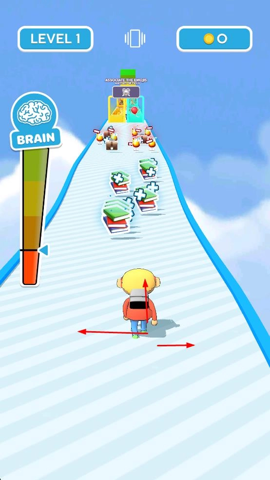 在LEVEL1等關卡中,操控角色在賽道上移動,可左右移動收集賽道上的書本等物品,提升BRAIN值。