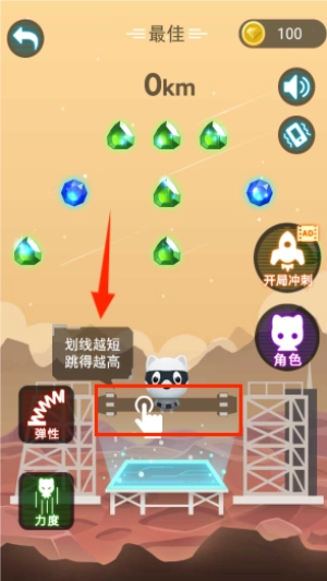 開啟沖刺,踏上奇妙旅程,上方的數(shù)值代表著你的彈跳飛行距離。
