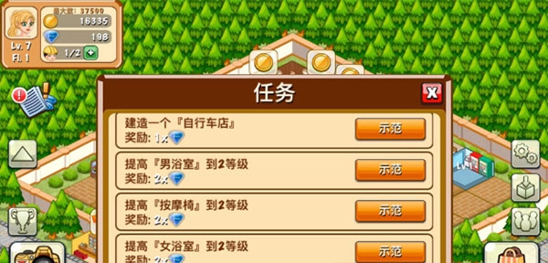 大概在20級前后會解鎖投資快速接待的任務,這個任務務必完成;到了30級時,需要投資100萬來新增一名工人,這一步也得做好。之后只要工人有空,就優先建造男浴室和女浴室;接下來盡量安排出一名工人去建自動取款機,并且把取款機的等級升到5級左右,這兩步特別關鍵,都是后續環節要用到的!最后一步是購買漲價幅度小的道具,每次刷新后買10個;前面提到的消費設施則買2次。
