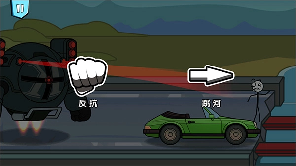 玩家啟動火柴人歷險記游戲后,點擊開始按鈕進入游戲。在游戲里,火柴人遭到一個機器人的追逐,被逼至斷橋邊緣,此時玩家需要在反抗和跳河這兩個選項中做出選擇,而不同的選擇會導向不一樣的結局。