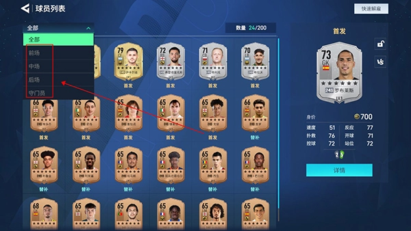 游戲中的球員被劃分為前場、中場、后場和守門員這四類,每一類球員都承擔著不同的功能,玩家能夠自主進行組合搭配。