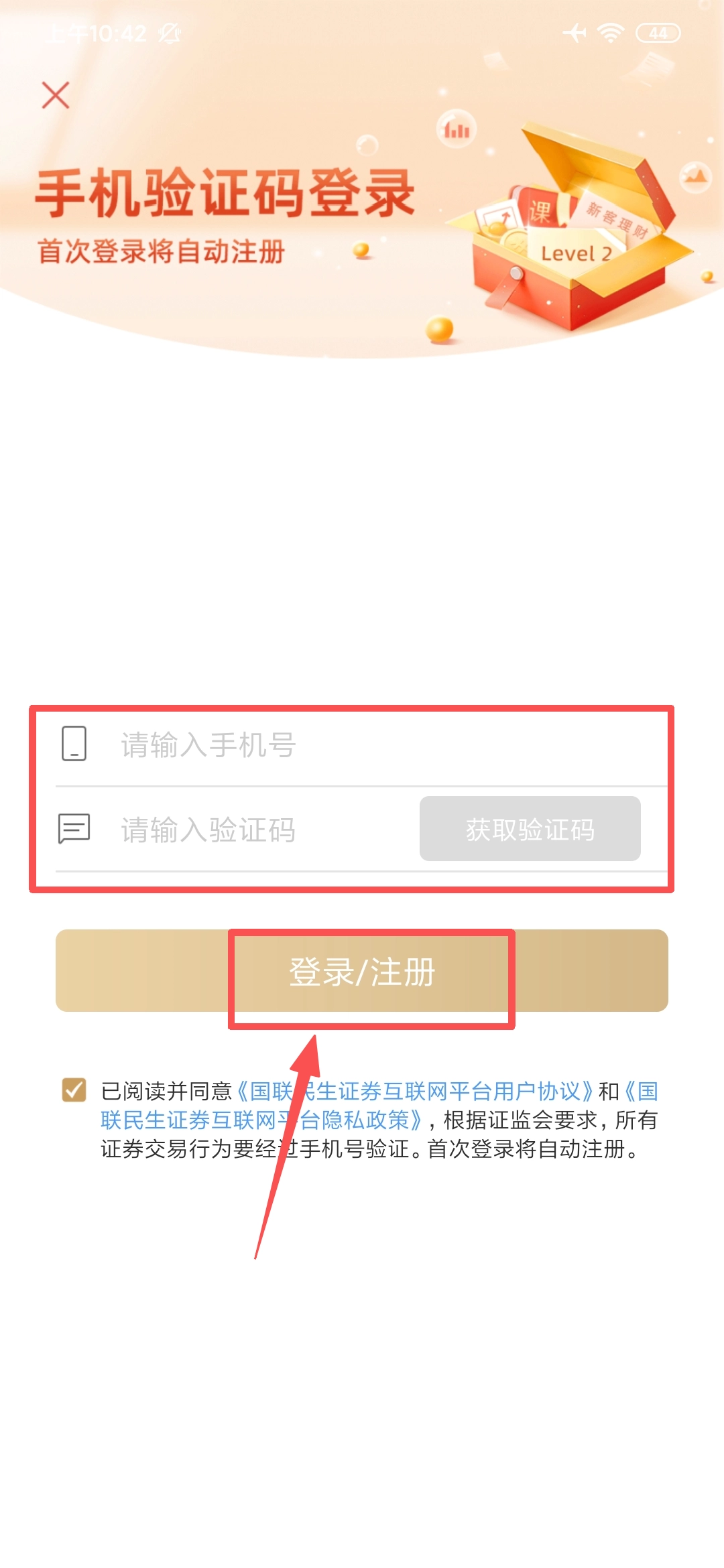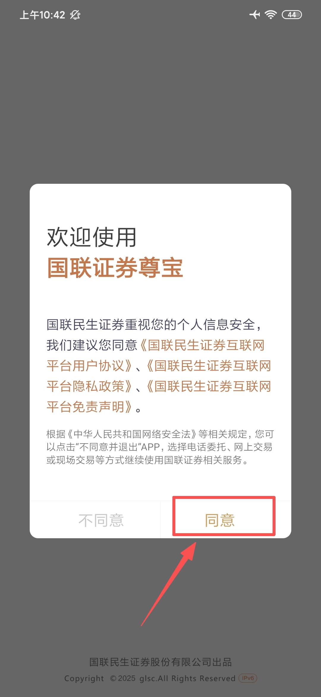 在國(guó)聯(lián)證券尊寶的歡迎彈窗中點(diǎn)擊同意,確認(rèn)相關(guān)協(xié)議后,即可進(jìn)入驗(yàn)證碼登錄界面。