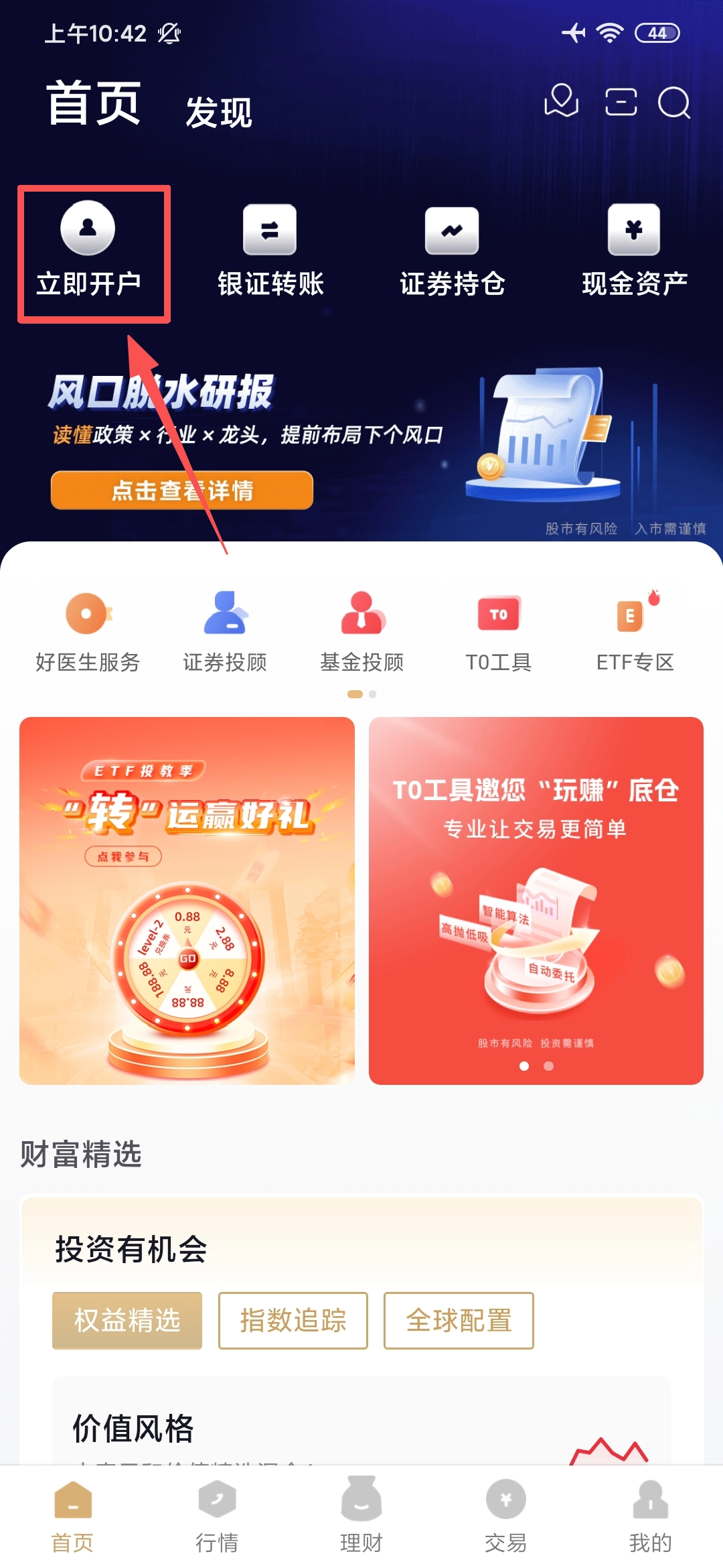 進(jìn)入應(yīng)用首頁(yè)后點(diǎn)擊“立即開戶”選項(xiàng),頁(yè)面會(huì)跳轉(zhuǎn)到身份類型選擇界面。
