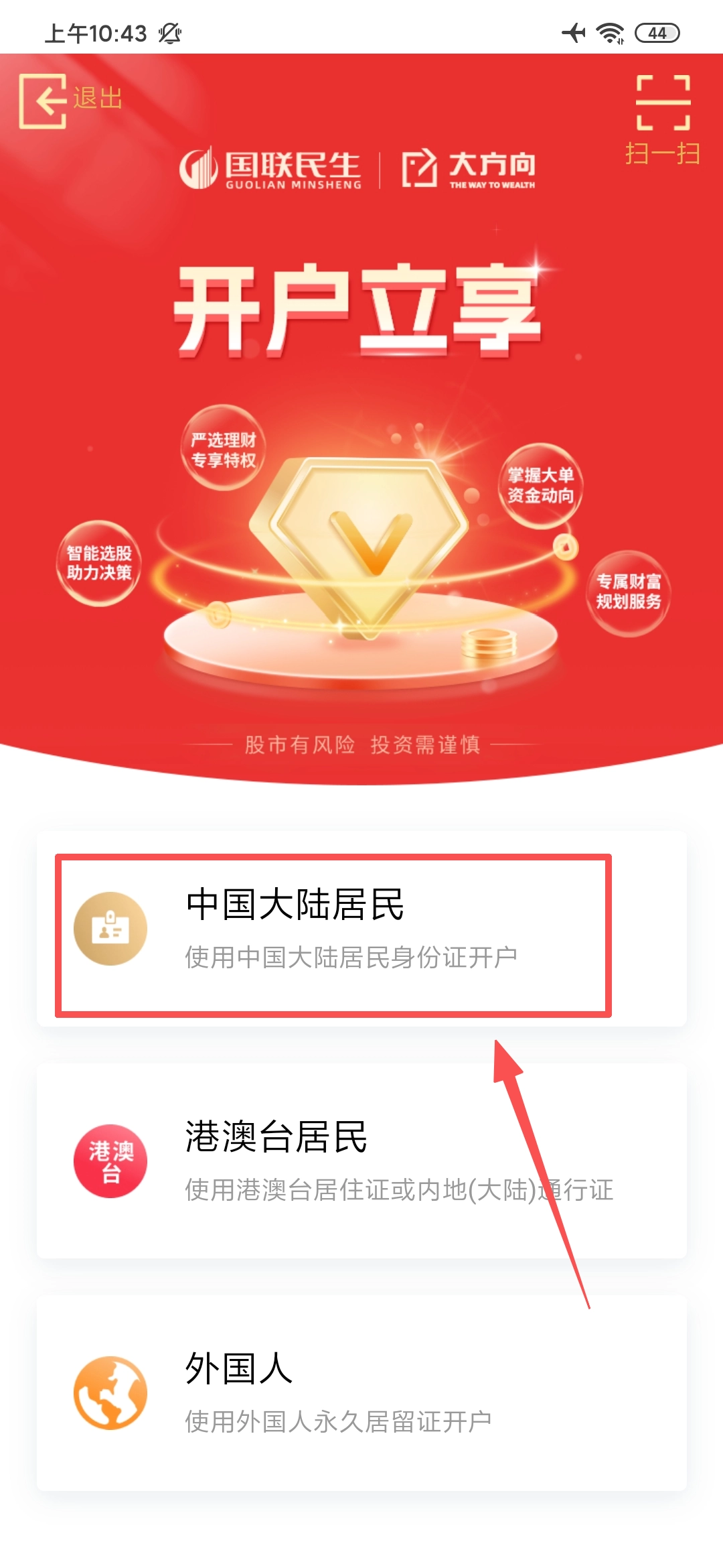 在身份選擇界面選擇中國(guó)大陸居民這一選項(xiàng),就能進(jìn)入該身份對(duì)應(yīng)的開戶流程。