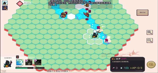 點擊角色后,會顯示出該角色可活動的范圍;我們只需雙擊這個范圍內的任意版塊,就能操控角色進行移動。