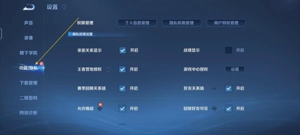 滑動到顯示【功能/隱私】的位置時暫停操作,隨后點擊該選項進入詳細設置頁面。