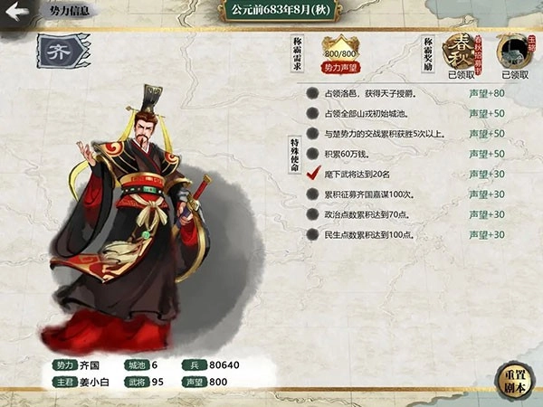 在春秋副本中,當勢力聲望達到800點時就能完成通關,不存在其他額外的要求。想要提升聲望,可以通過以下幾種方式:完成特殊任務、在戰斗中取得勝利、進行巡查活動、開展建造工作、與其他勢力結盟、釋放俘獲的俘虜以及登庸其他武將。