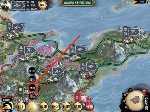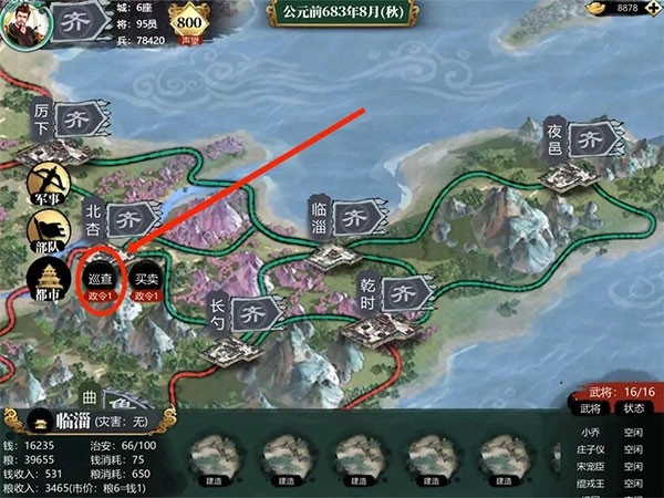 治安值滿百的城池可停止巡查。多余的政令優先用于與接壤國家結盟,以此避免因戰斗耗費時間。計劃招募全部魅力型武將后,再結束當前回合。