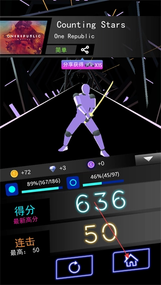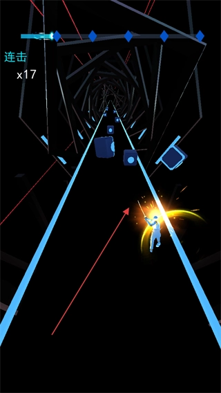 根據方塊襲來的方向與角度,點擊屏幕來操控角色揮劍擊打方塊,以此獲得連擊數,例如連擊x17。